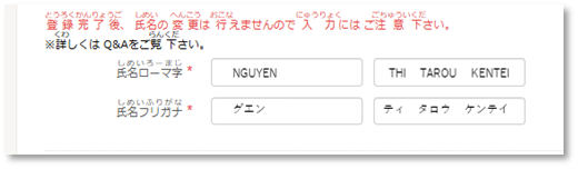 ミドルネームがある場合、氏名ローマ字の項目の、「MEI(名)」にミドルネームとファーストネームを両方入力してください。ミドルネームとファーストネームの間には全角スペースを入力してください。氏名フリガナの項目も同じように、「メイ」にミドルネームとファーストネームのフリガナを両方入力してください。ミドルネームとファーストネームの間には全角スペースを入力してください。 必ず在留カードと同じ表記になるように注意してください。