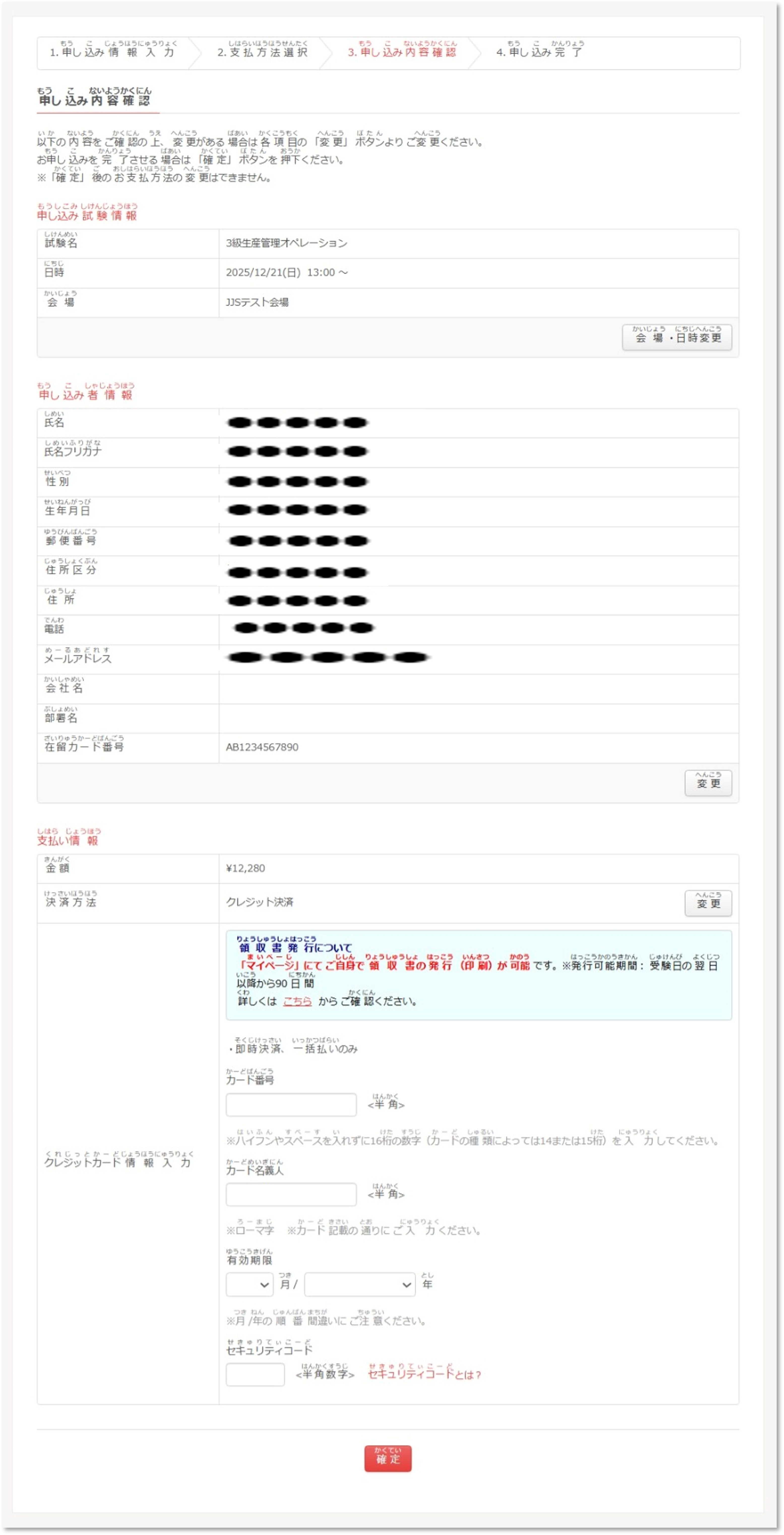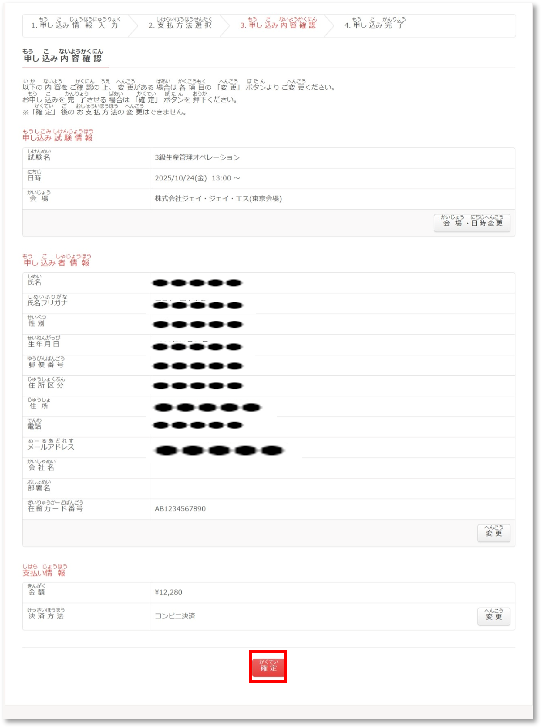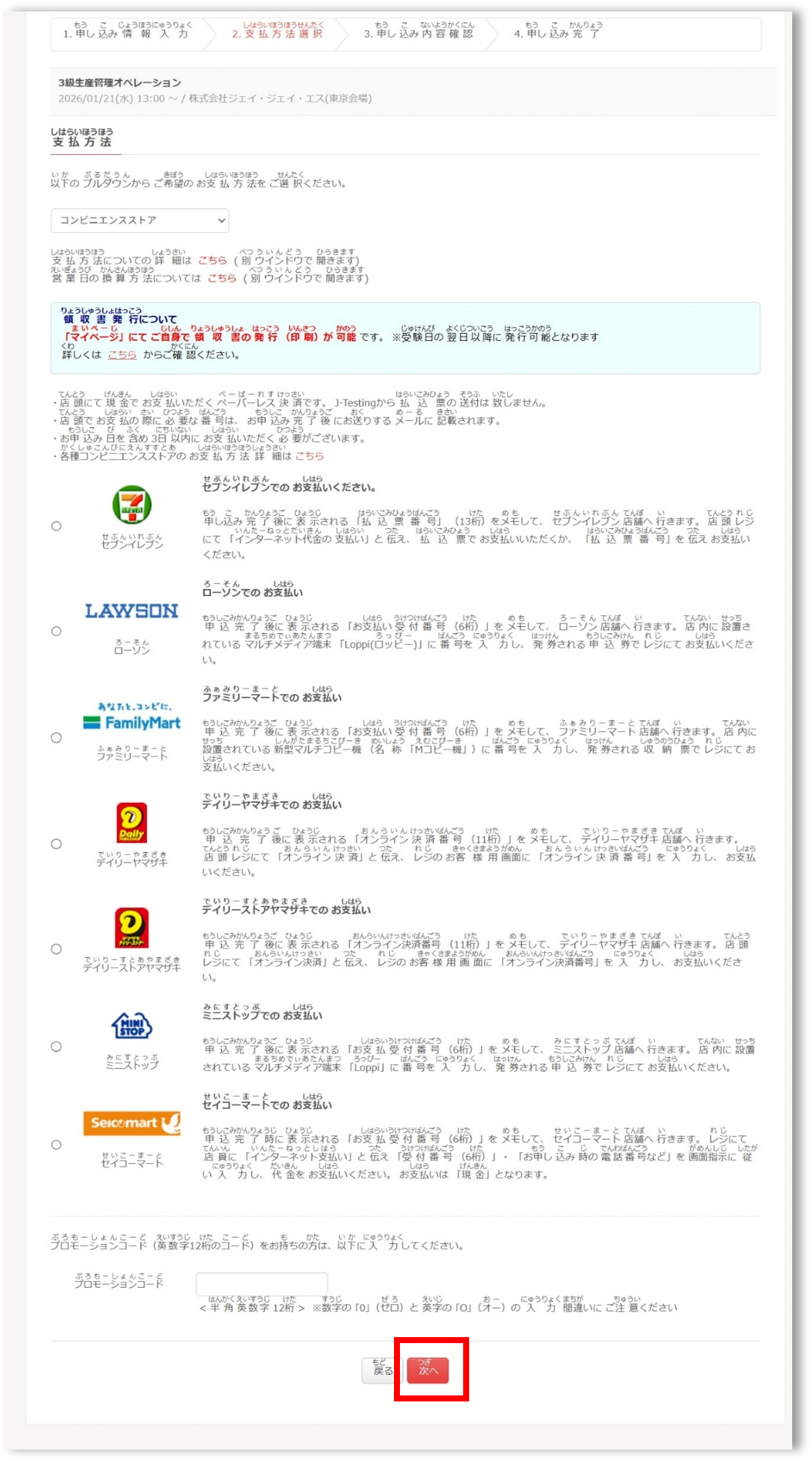 各種コンビニの選択画面が表示されます。任意のコンビニを選択後、「次へ」ボタンをクリックします。その後申し込み情報確認画面が表示されます。「コンビニ」の場合は申込情報に間違いがなければ「確定」ボタンを押し、試験予約申込を確定します。
