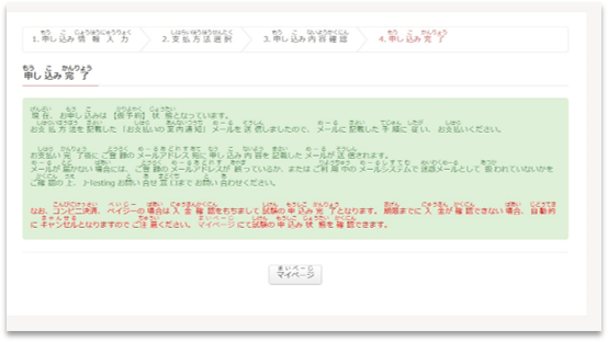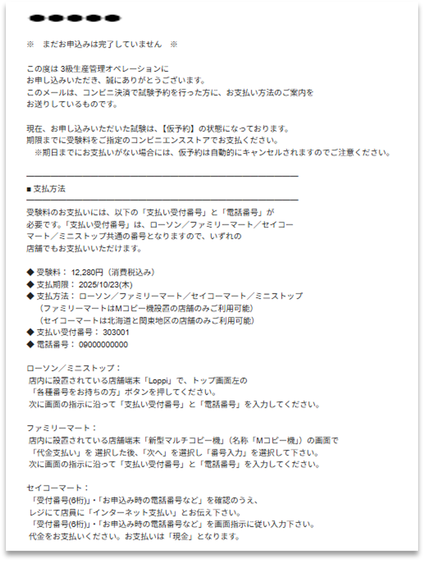申し込み完了画面が表示されますが、コンビニでの支払いが完了するまではお申し込みは仮予約状態となります。