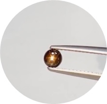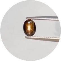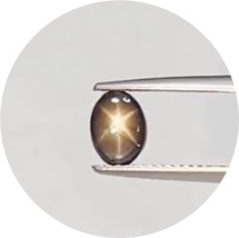 解説:ブラック・スター・サファイアは、光を当てると6条の星が現れるのが特徴です。これは3方向に微細な針状インクルージョンが存在し、光を反射するために現れます。ボディカラーはブラックですが、色帯には微細な針状インクルージョンによる虹色の干渉色も見ることができます。